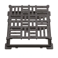 Dispositif de fermeture en fonte, comprenant un cadre carré et une grille plate.