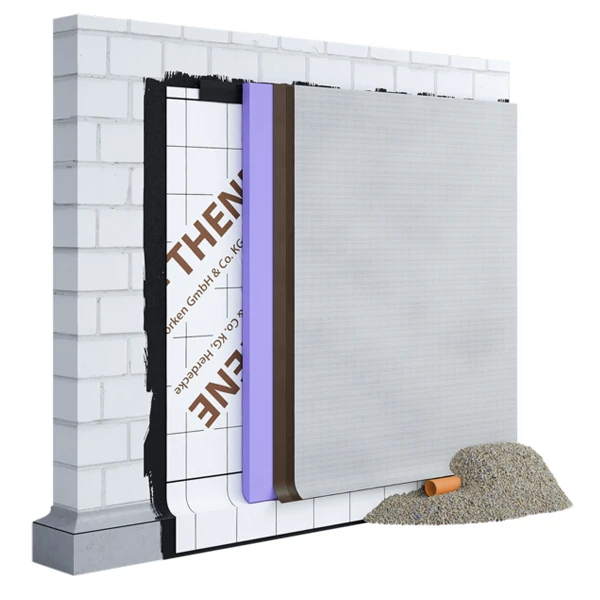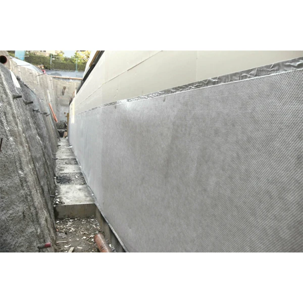 Les excroissance sont orientées vers le remblai. Le géotextile spécial à résistance accrue crée une lame d’air de découplage entre le remblai humide et la paroi. Au moment du remblaiement, la nappe protège efficacement le support (mur en béton banché, maçonnerie, imperméabilisation, étanchéité, isolation par l’extérieur…).