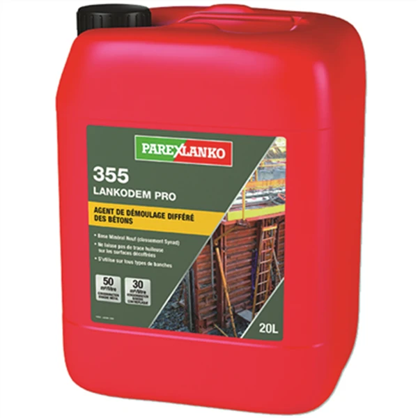 LANKODEM PRO 355 est un agent de démoulage différé prêt à l’emploi. Il s’applique par pulvérisation sur la surface d’une banche métallique, polyuréthane, ABS, polyester, bois bakélisé ou peint, pour assurer le décoffrage de tout béton démoulé après durcissement.