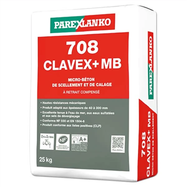 708 CLAVEX+ MB est un micro-béton à retrait compensé prêt à gâcher. Il se présente sous la forme d’une poudre grise dont les constituants actifs sont à base de liants hydrauliques sans chlorure ni particule métallique.