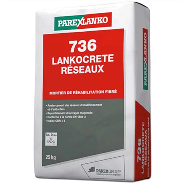 736 LANKOCRETE RESEAUX est un mortier de réhabilitation fibré. Il se présente sous la forme d’une poudre à base de ciments spéciaux, de sables, de fibres synthétiques et d’additifs, sans chlorures ni particules.