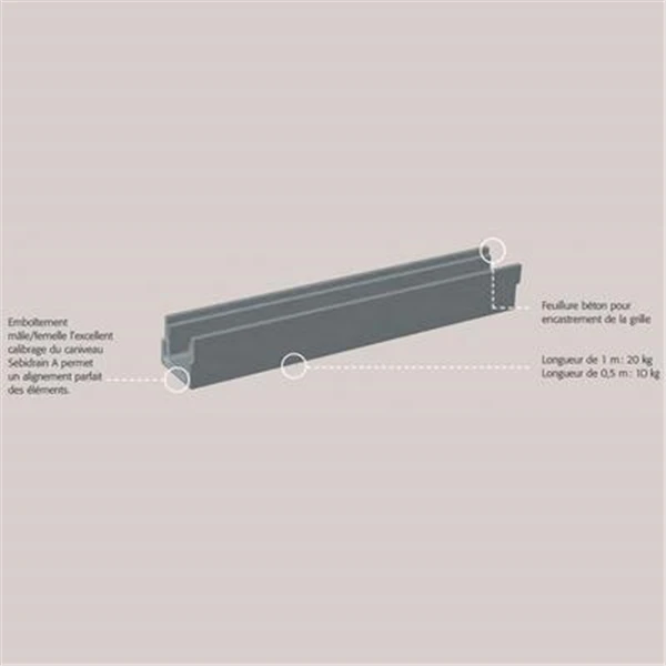 Sebico Caniveau SEBIDRAIN A + Grille Caillebotis Résistance : Classe B125