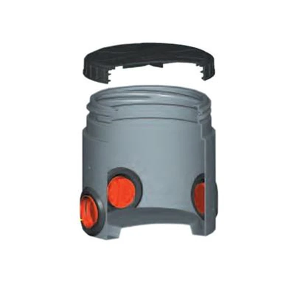 Regard en polyéthylène haute densité traité anti-UV. Entrée et sortie munies d’un joint souple à lèvre. Couvercle à visser en polyéthylène, étanche à l’eau et à l’air.